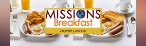 You are invited to join us on Sunday, December 7, at 9:00 a.m. for our annual Missions Breakfast. Rev. Dane Jackson, Manager for Mission Service with Cooperative Baptist Fellowhip, will present our program for our combined Sunday School. Everyone is welcome to attend!